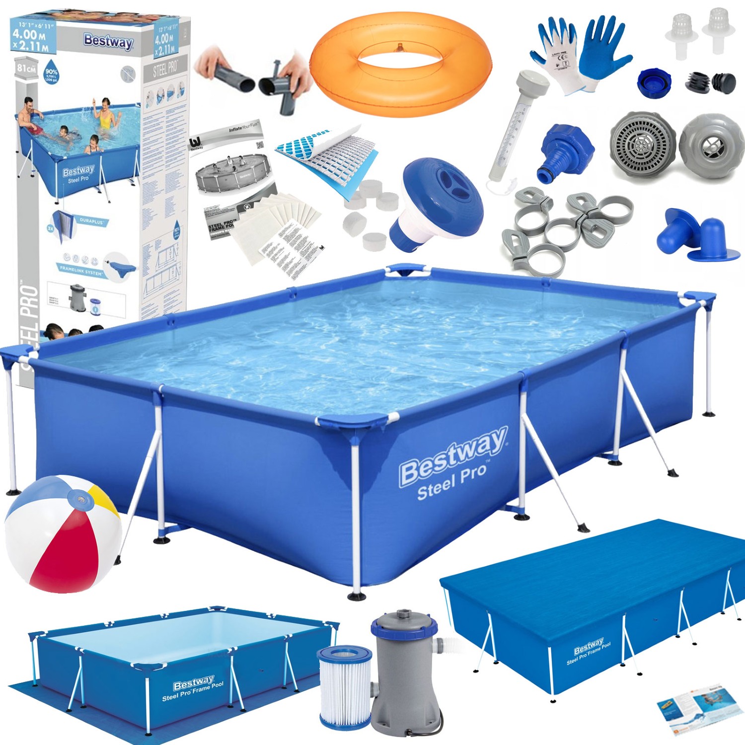 Nasz zestaw posiada wszystkie niezbędne akcesoria takie jak sitka, zaciski, zaślepki, spust wody itp., które pozwolą na łatwe rozłożenie basenu jak i jego złożenie, a także ułatwią codzienne użytkowanie basenu