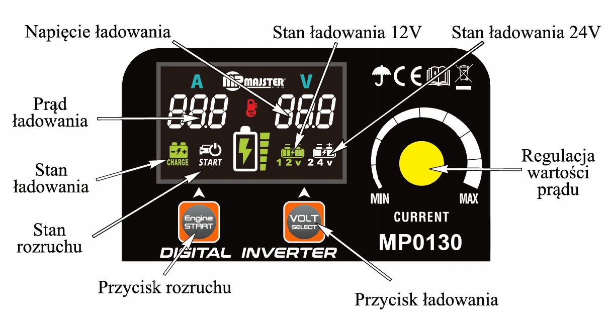 - Funkcja diagnostyki akumulatora - ładowarka stale monitoruje stan akumulatora.