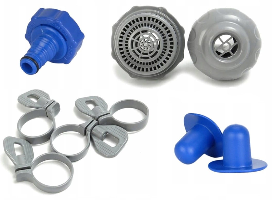 Nasz zestaw posiada wszystkie niezbędne akcesoria takie jak sitka, zaciski, zaślepki, spust wody itp., które pozwolą na łatwe rozłożenie basenu jak i jego złożenie, a także ułatwią codzienne użytkowanie basenu
