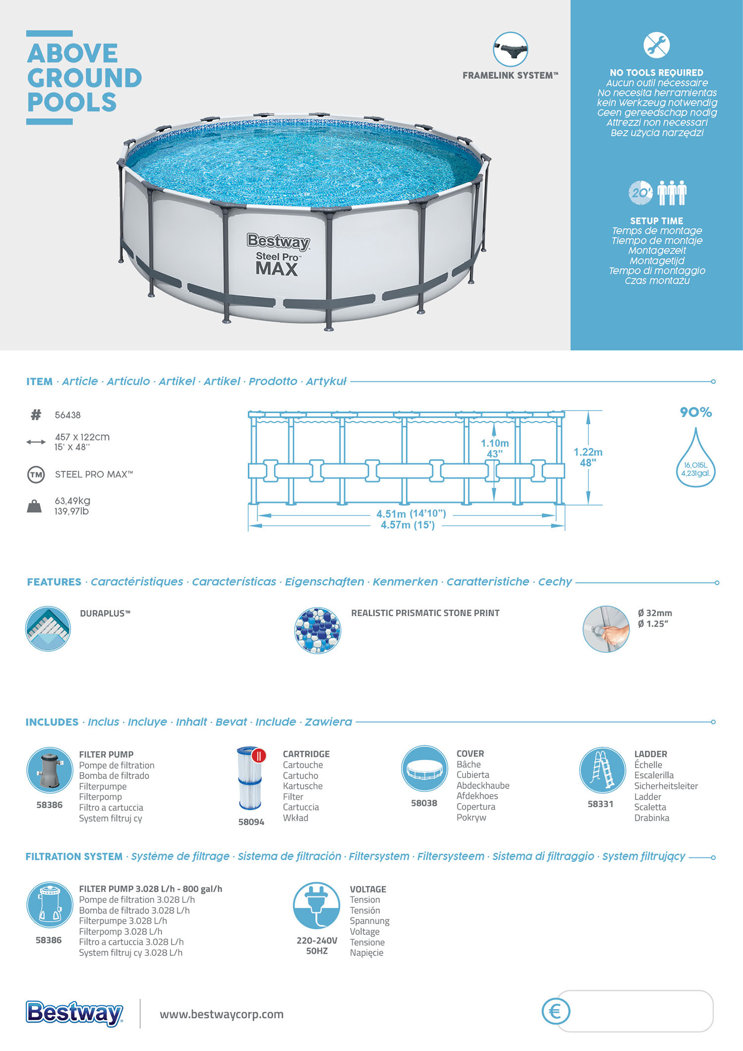 Basen Stelażowy Pro Max 457x122cm Pompa, Filtr, Pokrywa, Drabinka BESTWAY 56438